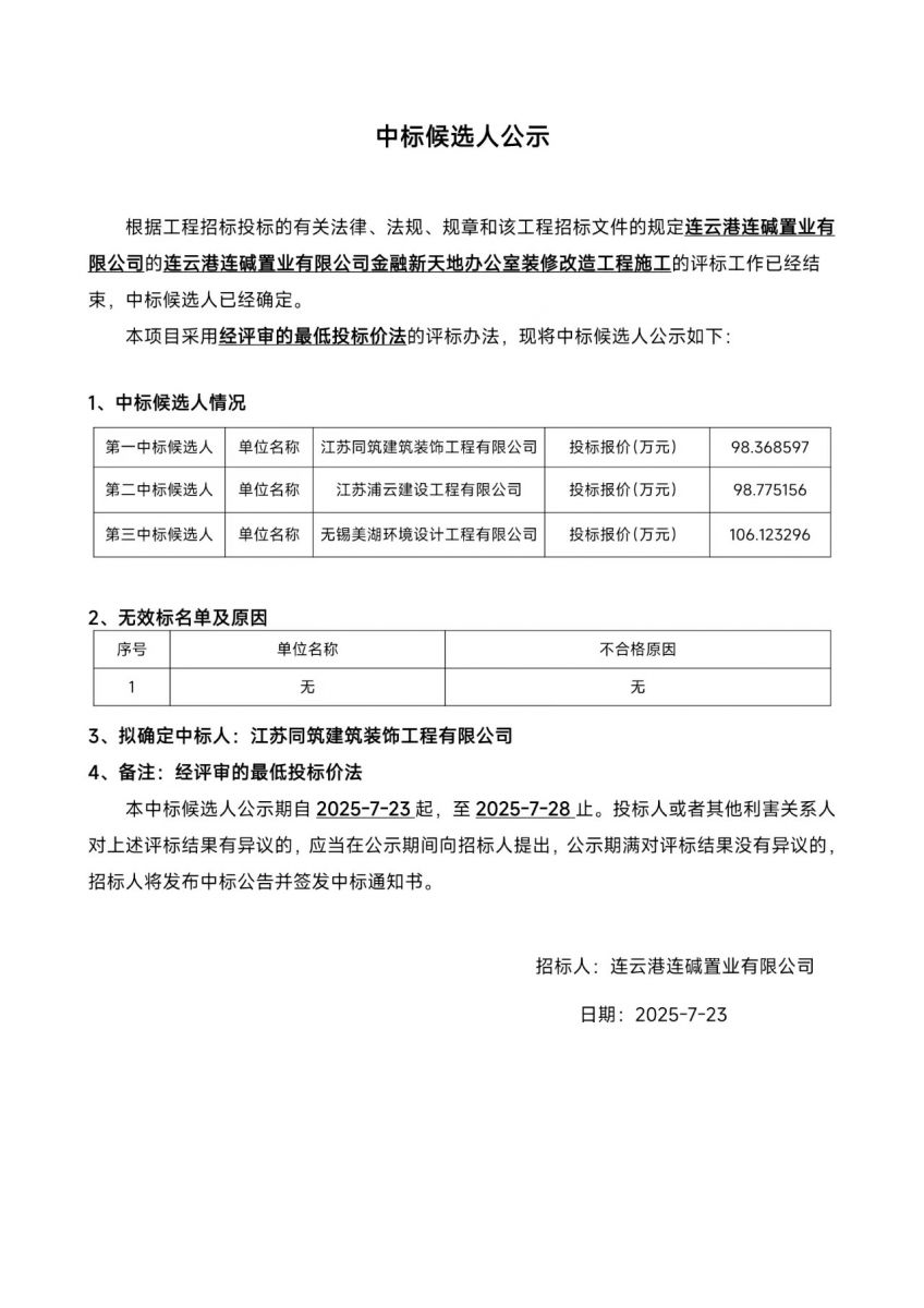連云港連堿置業(yè)有限公司金融新天地辦公室裝修改造工程施工中標(biāo)候選人公示
